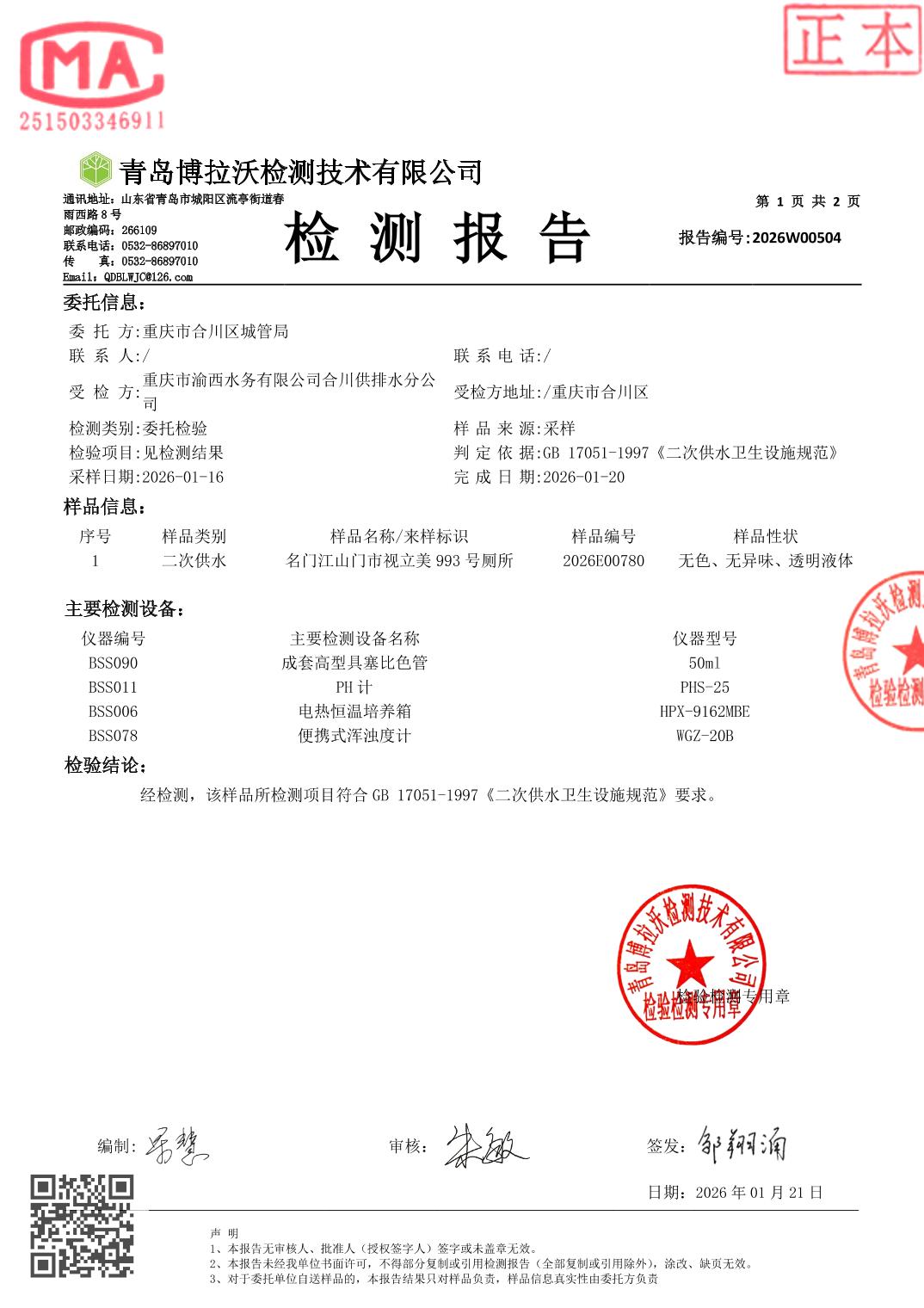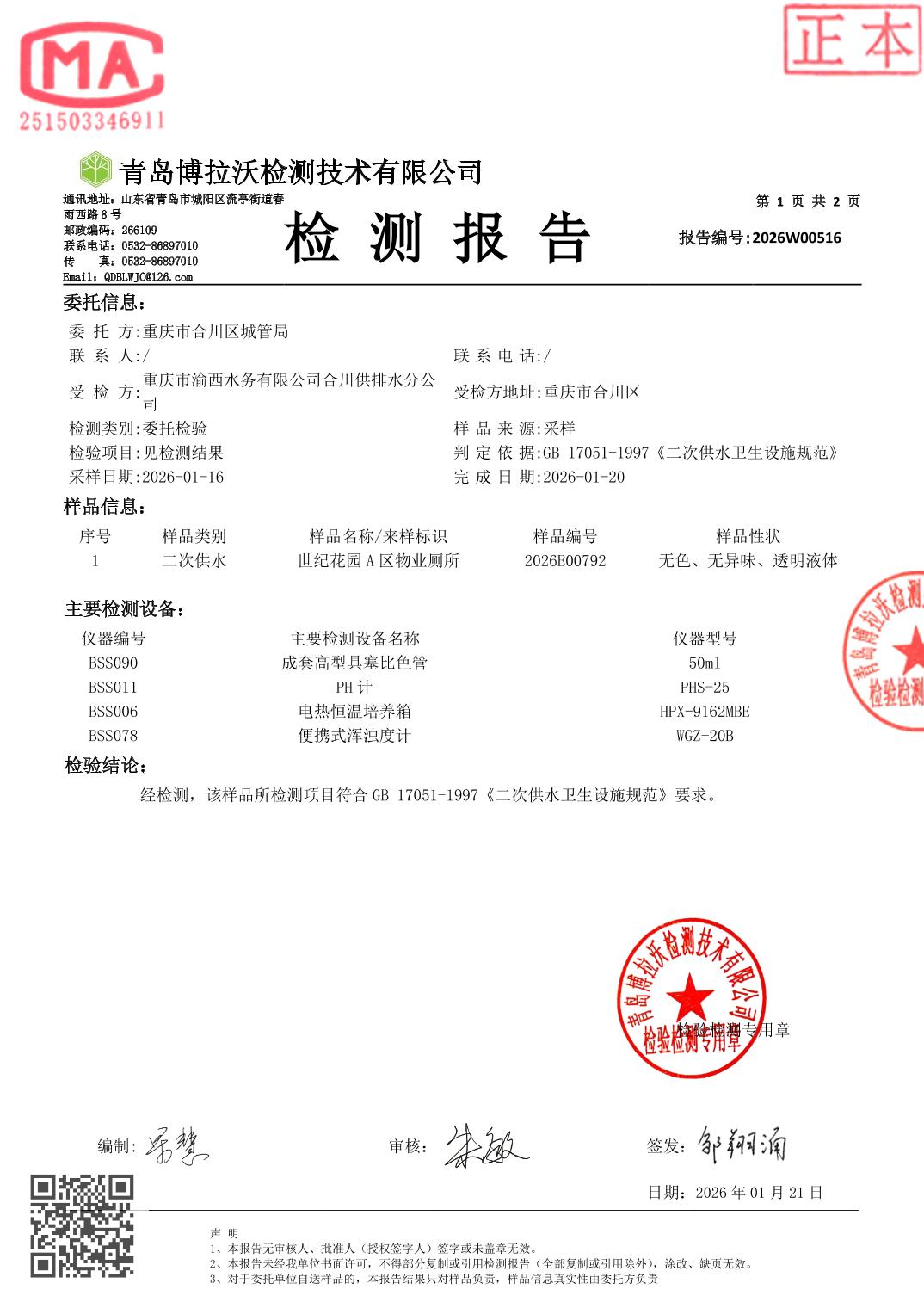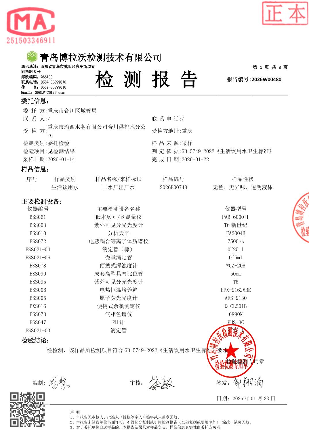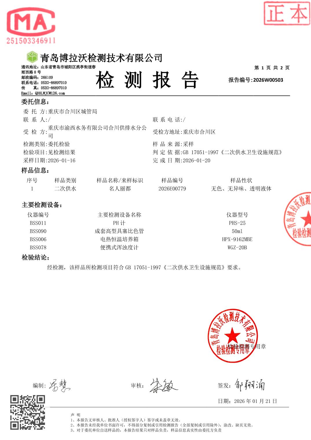 | [标 题] | 合川城区2026年1月水质监测报告 | ||