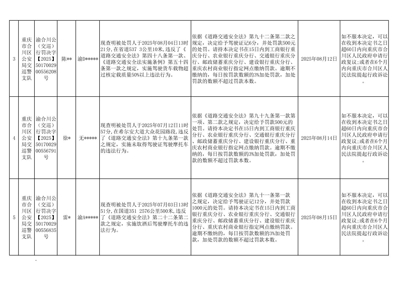 | [标 题] | 重庆市合川区公安局交巡警支队行政处罚决定结果公开(0811-0817) | ||
