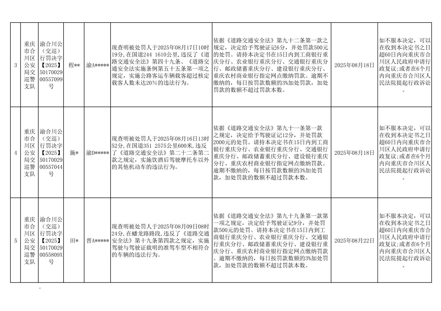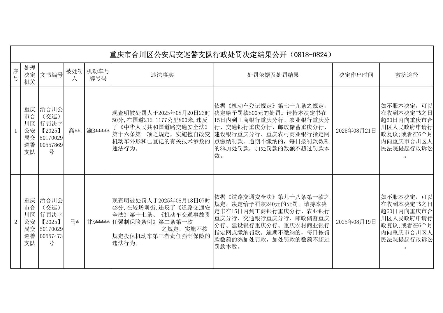 | [标 题] | 重庆市合川区公安局交巡警支队行政处罚决定结果公开(0818-0824) | ||