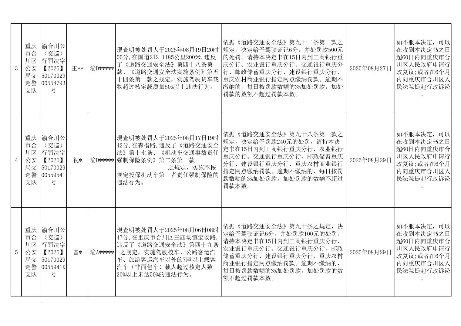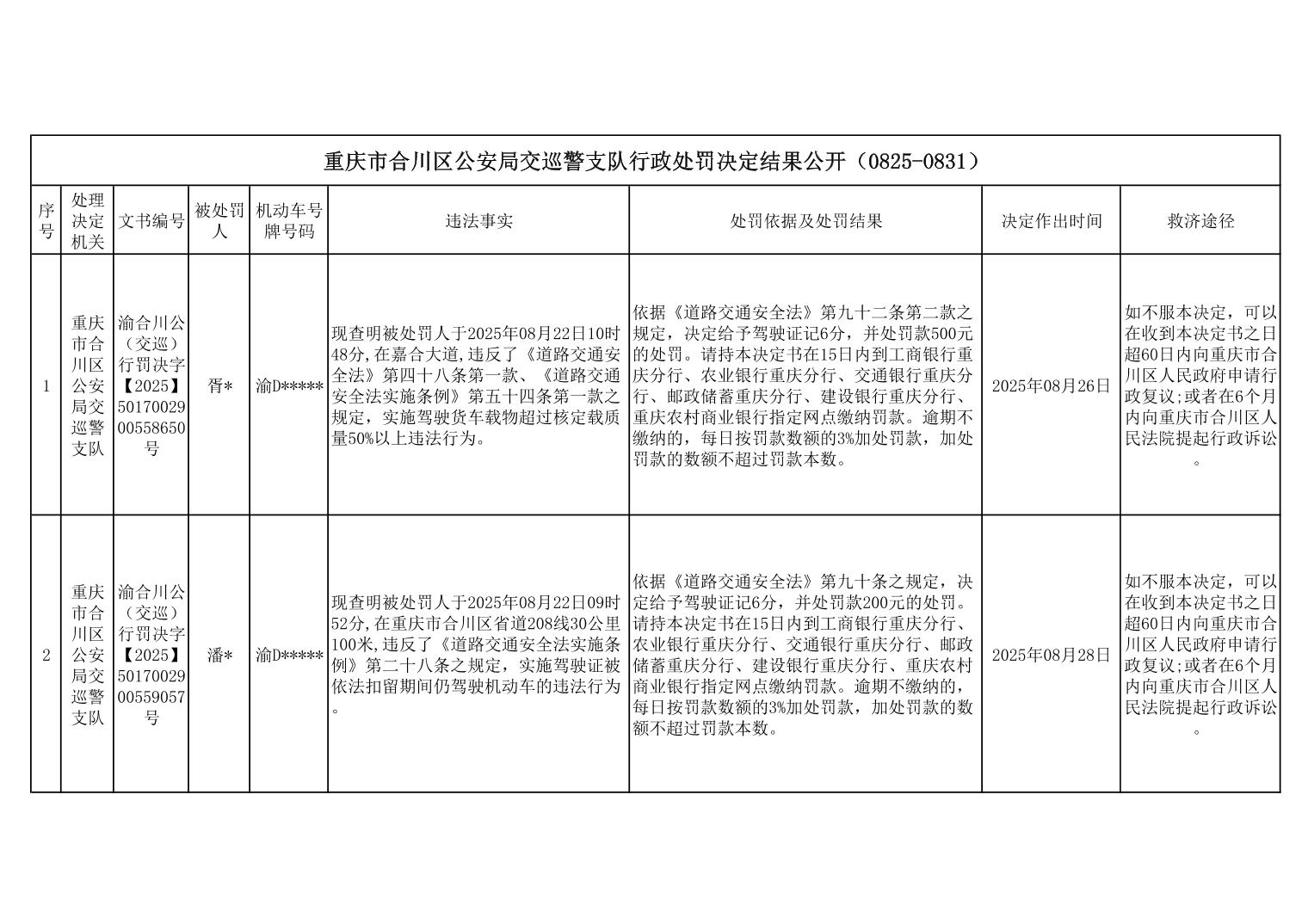 | [标 题] | 重庆市合川区公安局交巡警支队行政处罚决定结果公开(0825-0831) | ||