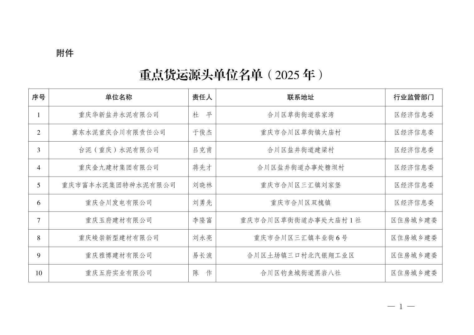 为持续深入治理货物运输车辆超限超载行为,加强货运车辆超限超载源头治理,督促各货运源头单位严格落实货运车辆合法装载和安全生产的主体责任,从源头上遏制超限超载违法行为发生,保护人民群众生命财产安全,保障公路及桥梁完好、安全和畅通,按照交通运输部《关于进一步加强全国治理车辆超限超载工作的通知》(交公路函〔2020〕298号)、重庆市安全生产委员会办公室《关于进一步深化道路货运行业安全专项整治工作的通知》(渝安办〔2021〕28号)以及《重庆市公路货物运输超限超载治理办法》要求,现将我区重点货运源头单位(2025年)名单向全社会公布,按照“政府主导、部门联动、立足源头、标本兼治”的总体要求,由重点货运源头单位的生产、经营许可机关和行业主管部门依职责加强对货运源头单位的监管,同时请社会各界对重点货运源头单位进行监督。