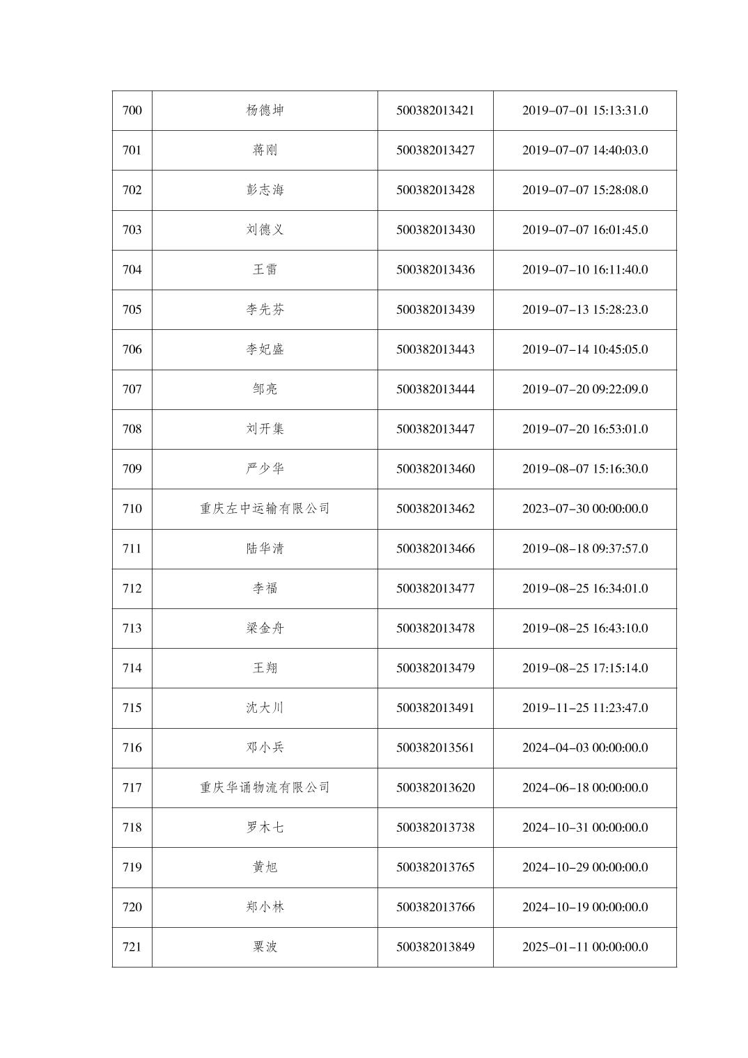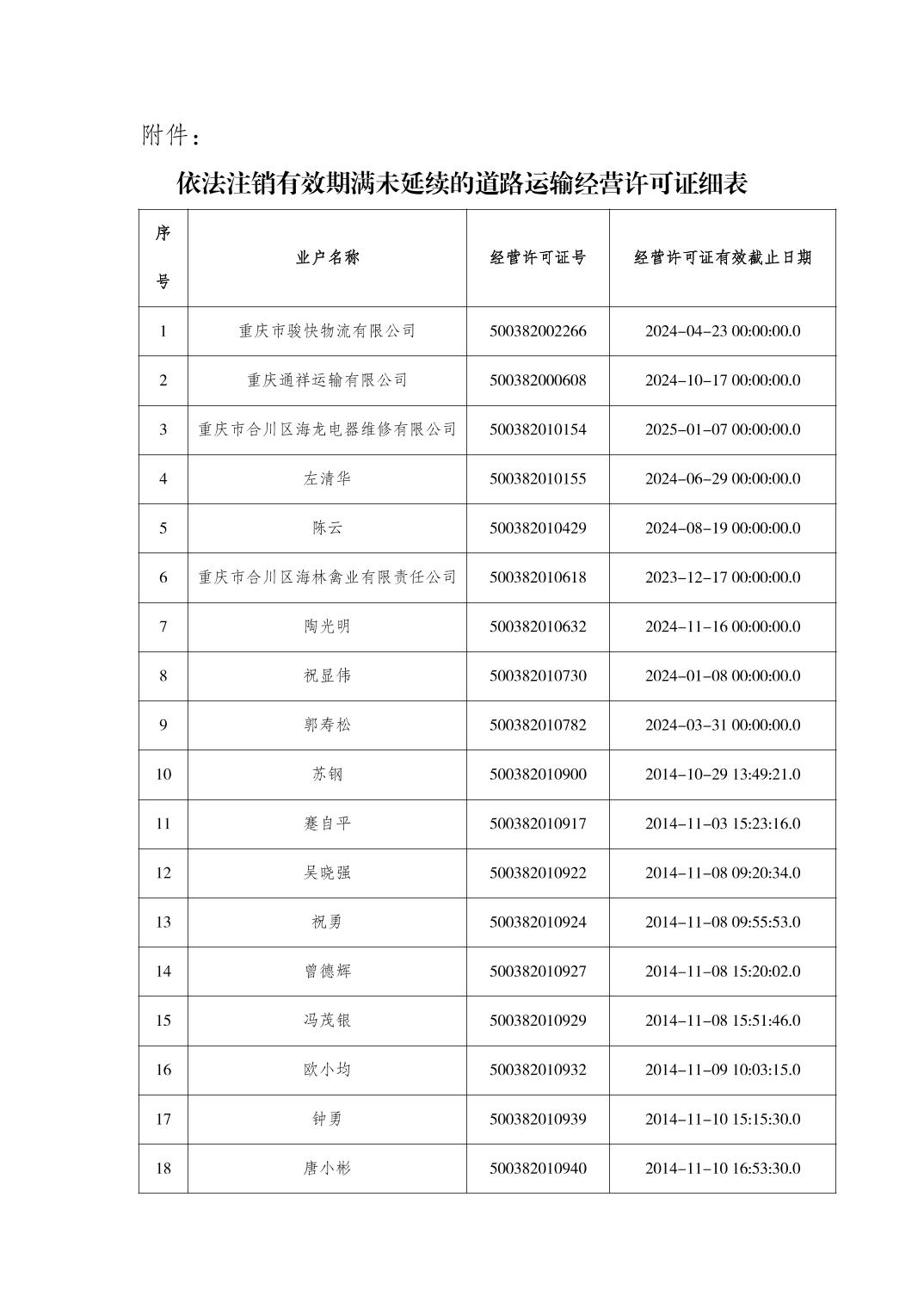 根据《中华人民共和国行政许可法》第七十一条(一)项“行政许可有效期届满未延续的”和《重庆市道路运输管理条例》第六十一条第二款“道路运输和道路运输相关业务的经营者取得经营许可后无正当理由超过一百八十日不投入运营或者运营后连续一百八十日以上停运,或者道路运输车辆逾期未进行年度审验超过一百八十日的,视为自动终止经营,由原许可机关收回并注销相应的道路运输经营许可证件、道路运输证件”之规定,我委依法对830家企业及个体有效期满未延续的道路运输经营许可证予以注销,特此公告。
