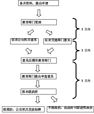 2.2012年9月30日前,在各区县(自治县)人民政府统一领导下,由教育部门牵头,公安、交通等部门配合,根据《条例》、《机动车运行安全技术条件》(GB7258)、《专用校车安全技术条件》(GB24407)等有关要求对行政区域内现有校车和校车驾驶人重新进行资格审核。即,由校车所有人提出校车使用许可申请(见附件5),区县(自治县)政府及其相关部门按规定程序予以审批,区县(自治县)政府审批同意后,校车所有人凭相关资料,提出校车标牌申请(见附件6),由区县(自治县)公安交管部门按校车标牌核发流程(见附件3),对符合相关规定和标准的,核发校车标牌;校车驾驶人填写《校车驾驶资格审批表》(见附件4),由区县(自治县)公安交管部门按校车驾驶资格审批流程(见附件2)进行审核,对符合条件的,在机动车驾驶证上签注准许驾驶校车,并通报教育行政部门。教育、公安交管部门要建立健全校车安全管理档案,严格做到“一车一档”,并及时将相关信息分类抄送交通等相关部门。