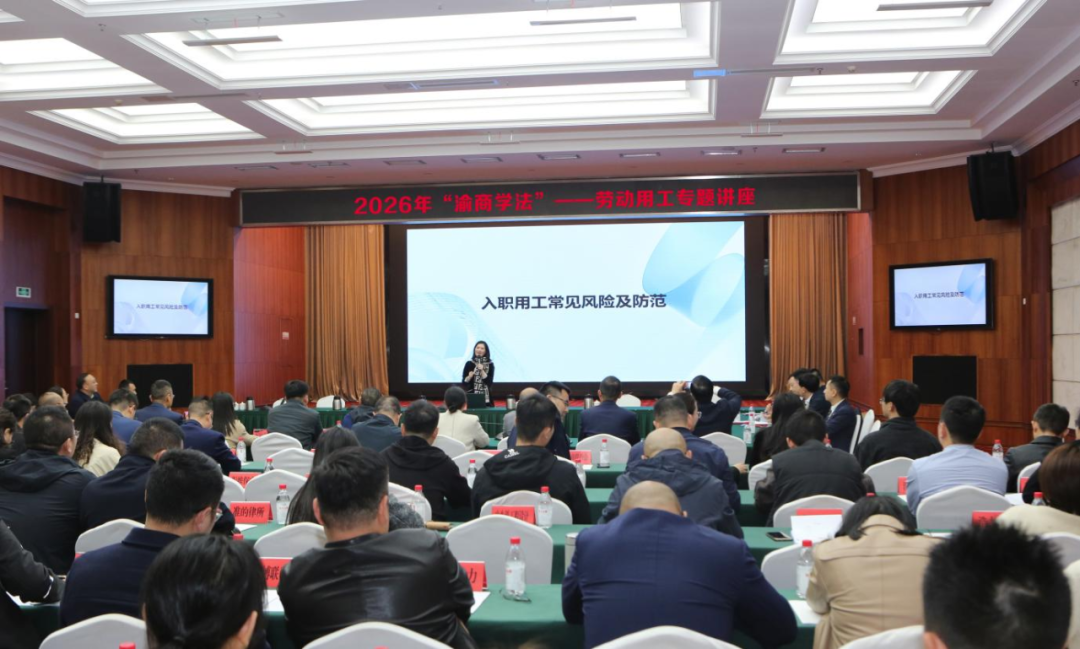 推进会后,随即开展了2026年首期“渝商学法”——劳动用工专题讲座。两江新区劳动人事争议仲裁院相关专家围绕“民营企业劳动用工合规与风险防范”,结合生动案例、法律法规和实操要点,围绕规章制度管理、劳动合同订立、劳动合同履行、劳动合同解除或终止等企业最关心的问题,进行了深入浅出的讲解,为与会人员上了一堂生动的普法课。从“法律条文”到“实操指南”,这场讲座将抽象的法规转化为企业可学可用的具体方法。