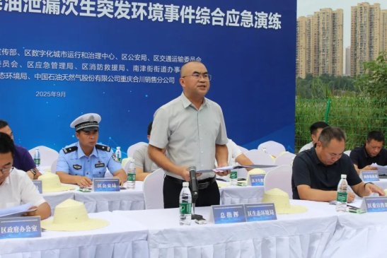 区生态环境局党组书记、局长陈仕春担任演练总指挥,市环境应急专家西南大学教授杨志敏进行现场指导。