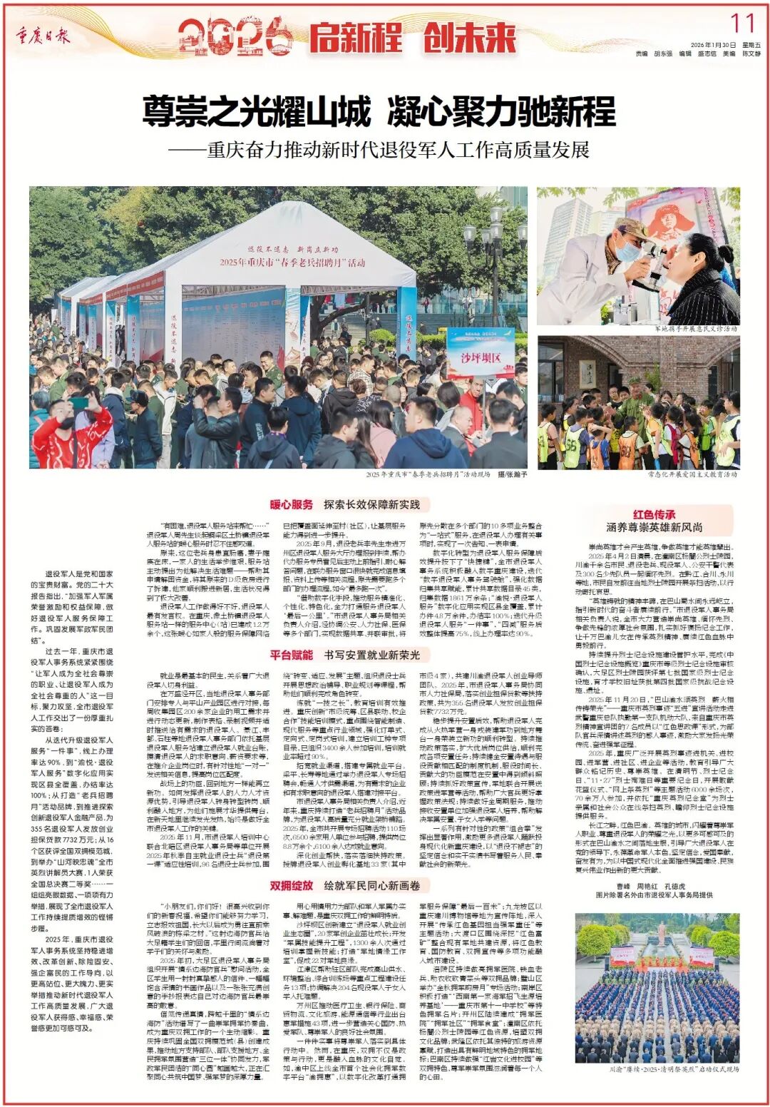 1月30日,《重庆日报》刊发整版报道《尊崇之光耀山城 凝心聚力驰新程——重庆奋力推动新时代退役军人工作高质量发展》,聚焦2025年全市退役军人工作,以下为报道原文: