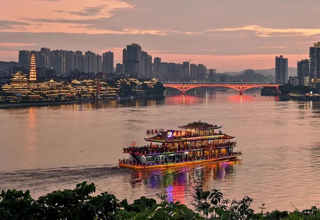 夜晚的江湾则有另一番风采,文峰古街被灯光点亮与涪江一桥、南屏大桥的光影交相辉映,江面倒映着万家灯火,灯光璀璨的“钓鱼城” 号穿梭江面,恍若一幅梦幻般的和美画卷。