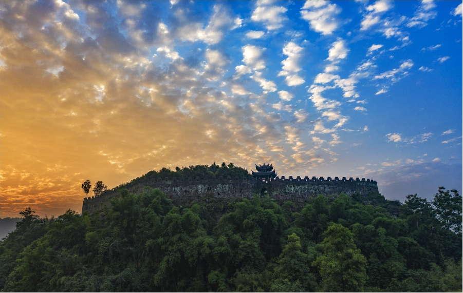 初秋时分,钓鱼城换上了一袭崭新的华裳,山上的树木正悄然酝酿着一场色彩渐变的奇妙魔术。此时,最适宜在护国门的石阶之上,静赏栾树花在微风中轻盈摇曳。那跨越千年的烽火硝烟,仿佛也在时光的流转中,幻化成枝头簌簌飘落的温柔秋意。