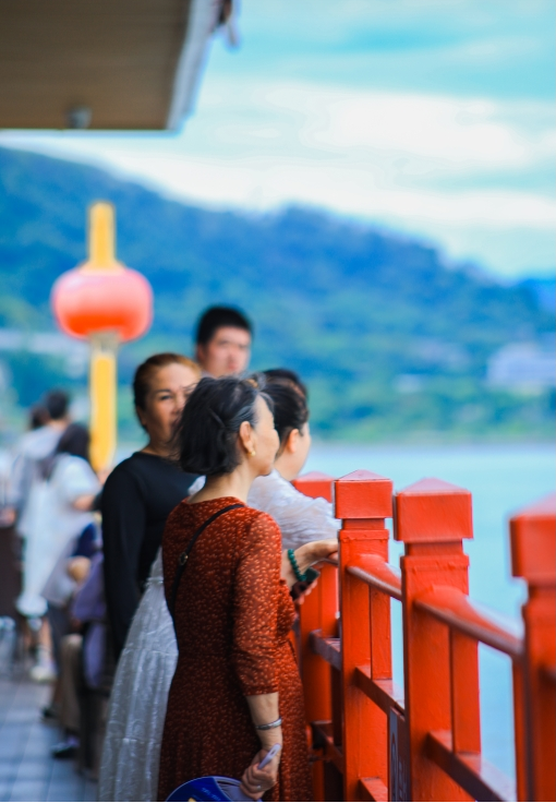 游客们轻倚在船舷上,沉醉地欣赏着两岸如诗如画的风光。