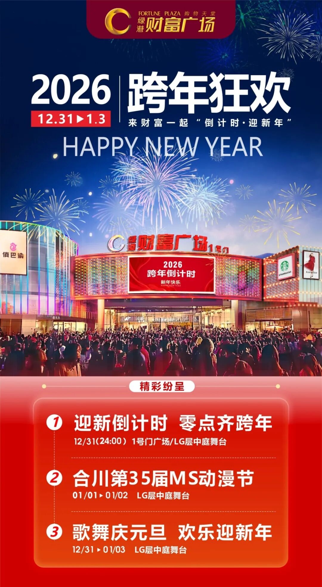 内容:零点齐跨年、合川第35届MS动漫节、歌舞庆元旦欢乐迎新年