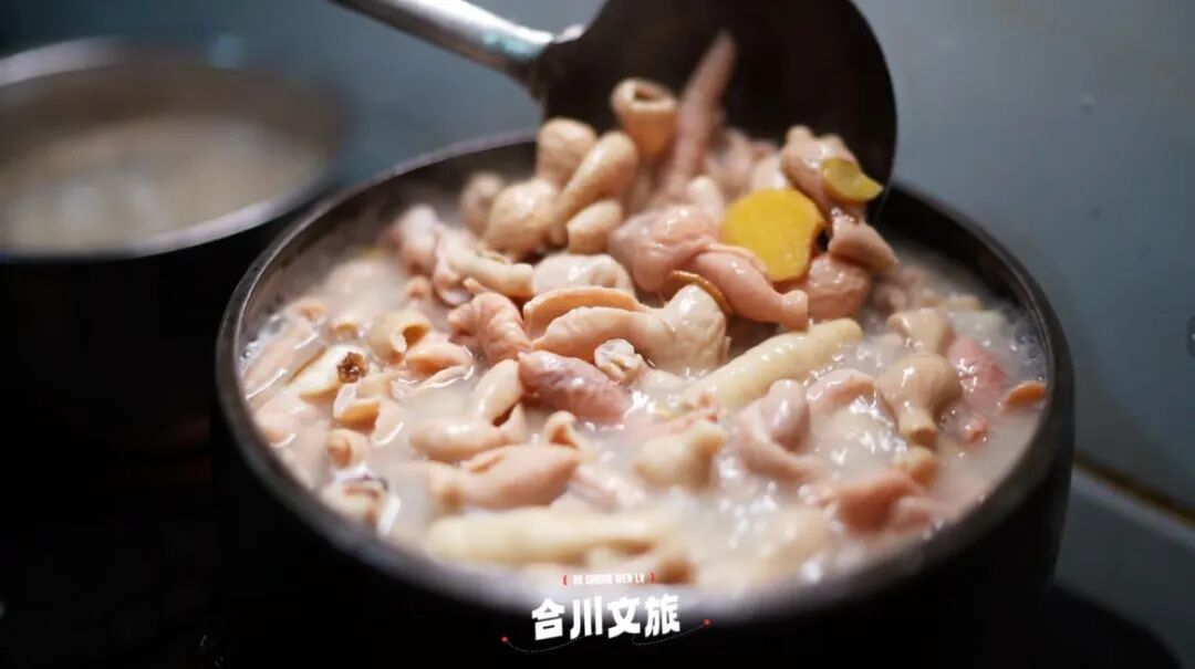 本品源自川渝 “杀年猪” 习俗,传承数百年,是合川年节民俗美食。以新鲜猪血、五花肉、猪杂为主料,搭配青草坝萝卜等辅料,经高汤慢熬、旺火快煮制成,汤鲜肉嫩、醇厚爽口。