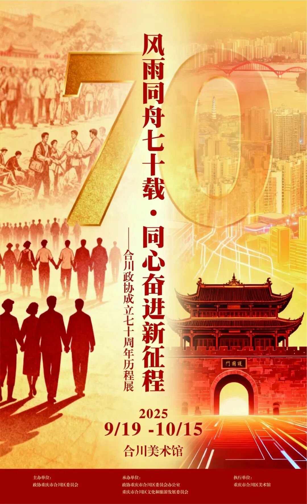 国庆期间各处展览百花齐放,区美术馆举办“风雨同舟七十载·同心奋进新征程”——合川地方政协成立70周年展览,通过历史文献、影像资料等呈现合川政协70年的奋进历程。