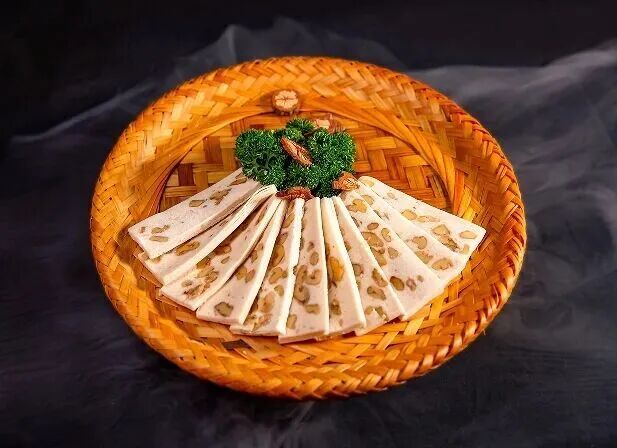 合川桃片是中国国家地理标志产品,为合川区的传统特产之一,始创于1840 年,是用上等糯米、核桃仁、川白糖、蜜玫瑰等原料精制加工而成。其色洁白、味香甜,片薄且入口即化,口感绵密,深受广大食客喜爱。