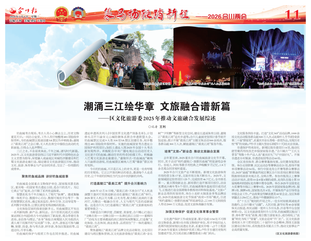 三江之水,不舍昼夜奔流,千年之城,谱写时代新篇。2025年,区文化旅游委坚持以习近平新时代中国特色社会主义思想为指导,深度融入成渝地区双城经济圈建设和巴蜀文化旅游走廊打造,锚定建设文化旅游强区目标,推动文化、旅游、体育事业与产业协同并进,交出了一份亮眼的成绩单。