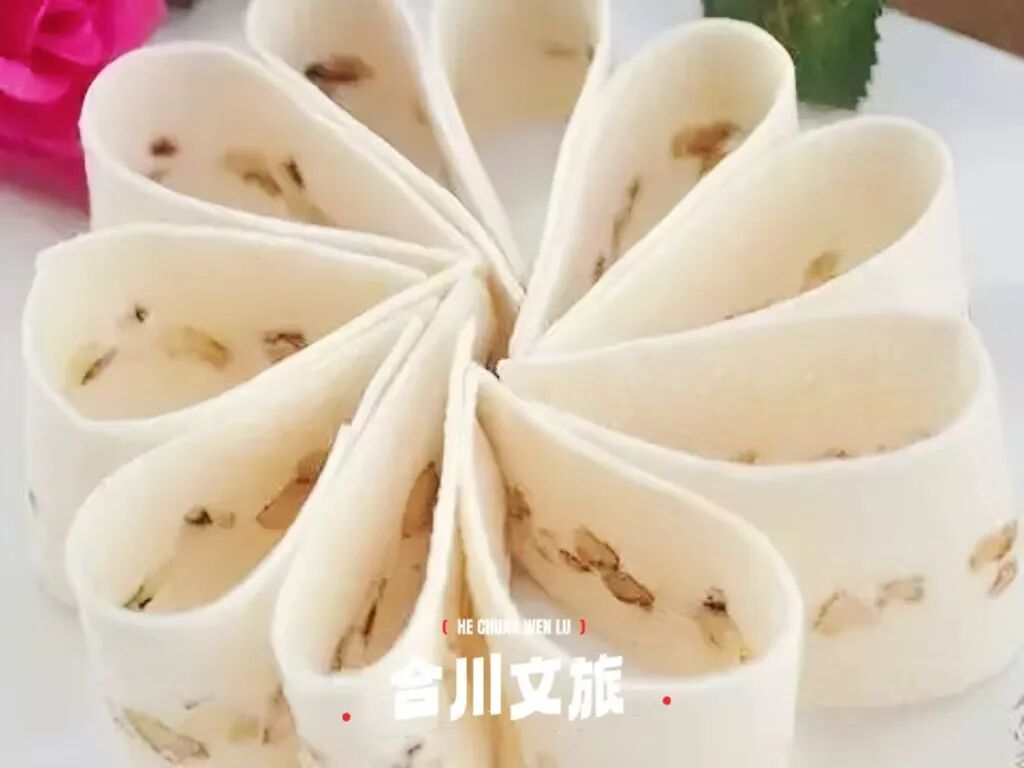 合川桃片是合川百年传统名点,有 150 多年历史。以糯米、核桃仁、白糖精制而成,片薄洁白,绵软香甜、入口即化,可直接食用或搭配饮品,承载地方文化,深受喜爱。