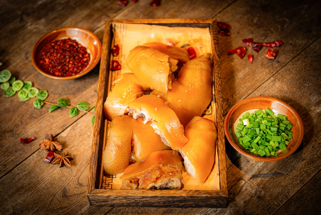 合川卤蹄花传承近百年技艺,是合川标志性经典美食。以本地黑猪猪蹄为主料,配以八角、桂皮等十余种香料,经刮洗、秘制卤制、文火焖炖而成,成品软糯耙香、入口即化、肥而不腻,富含胶原蛋白。