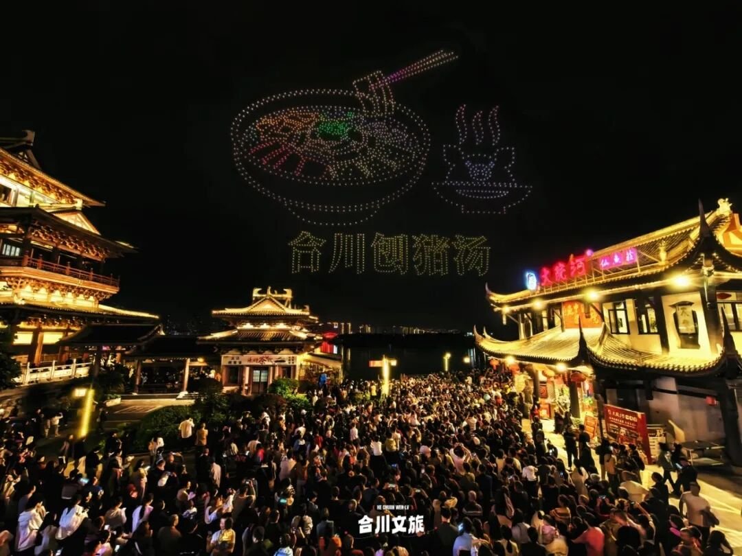同步在文峰古街开启的“跟着美食去旅行”(合川站)直播,令广大游客通过镜头感受合川美食文化和美丽景色。更有以川渝“校园之春”主题的无人机表演,以天为幕、以城为景,让青春风采与合川烟火气双向奔赴。这一夜,全网都被合川的香气与精彩深深吸引!
