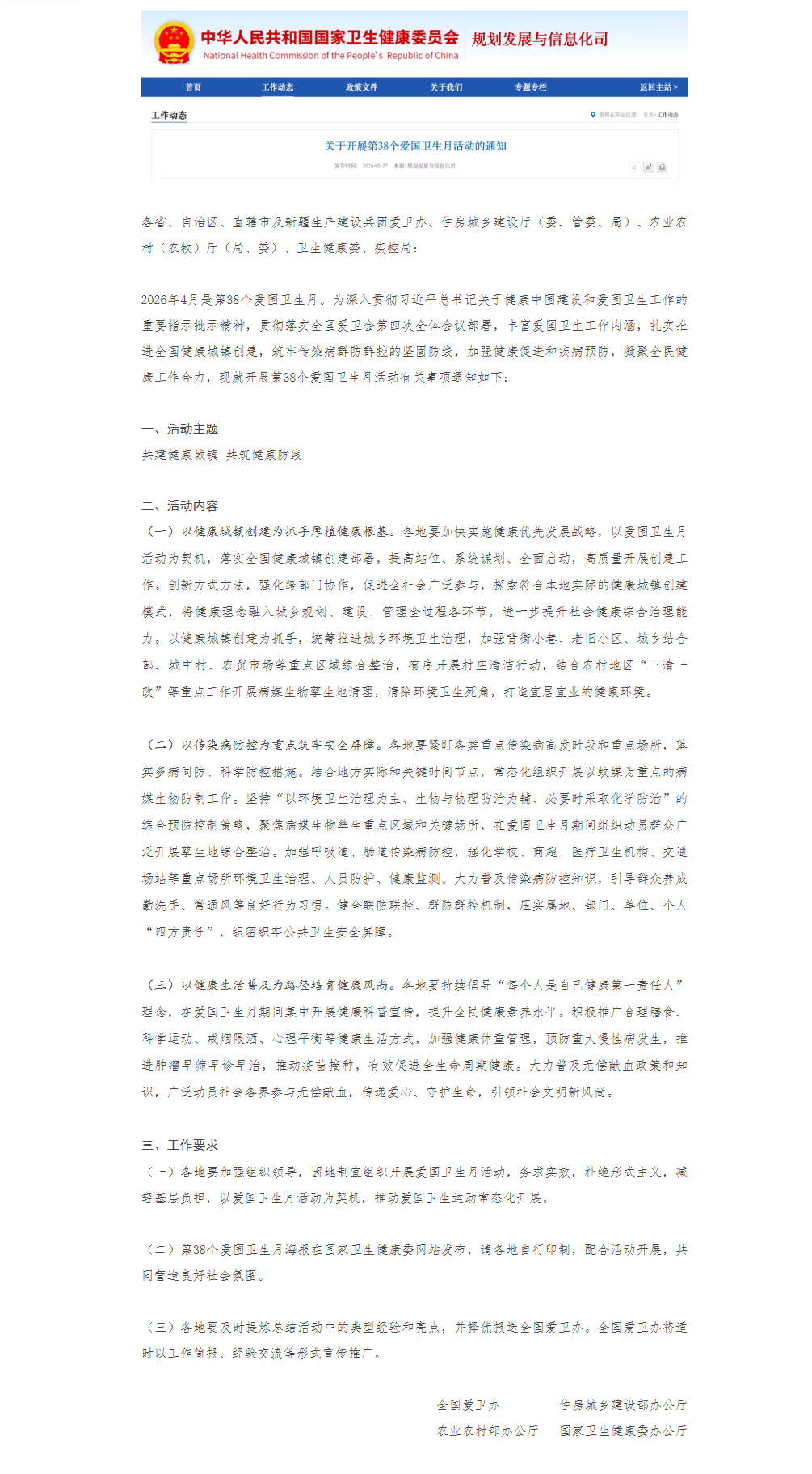 | [标 题] | 国家卫生健康委关于开展第38个爱国卫生月活动的通知 | ||