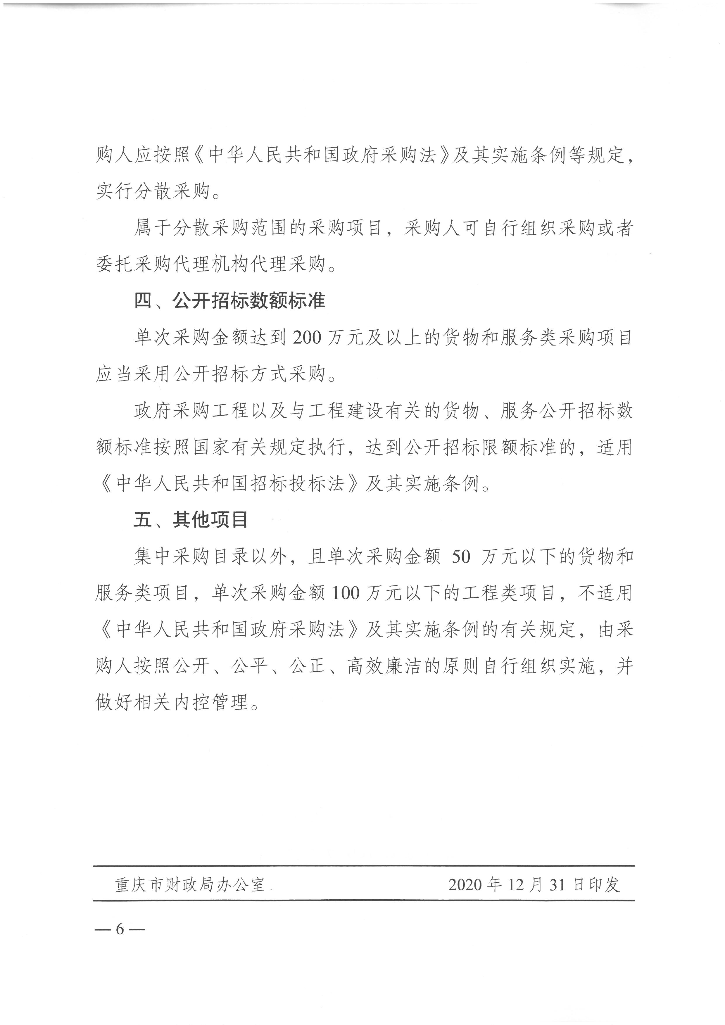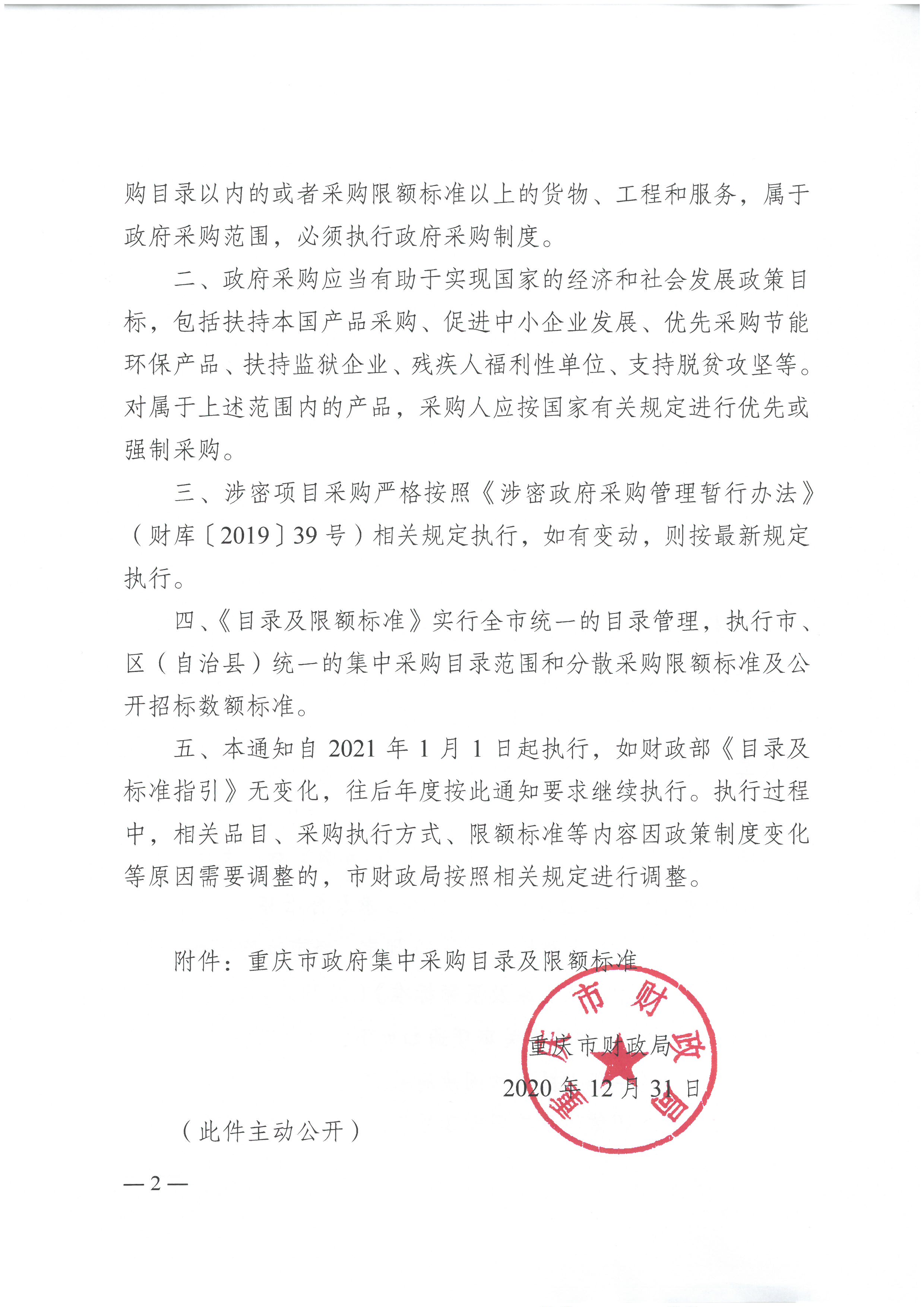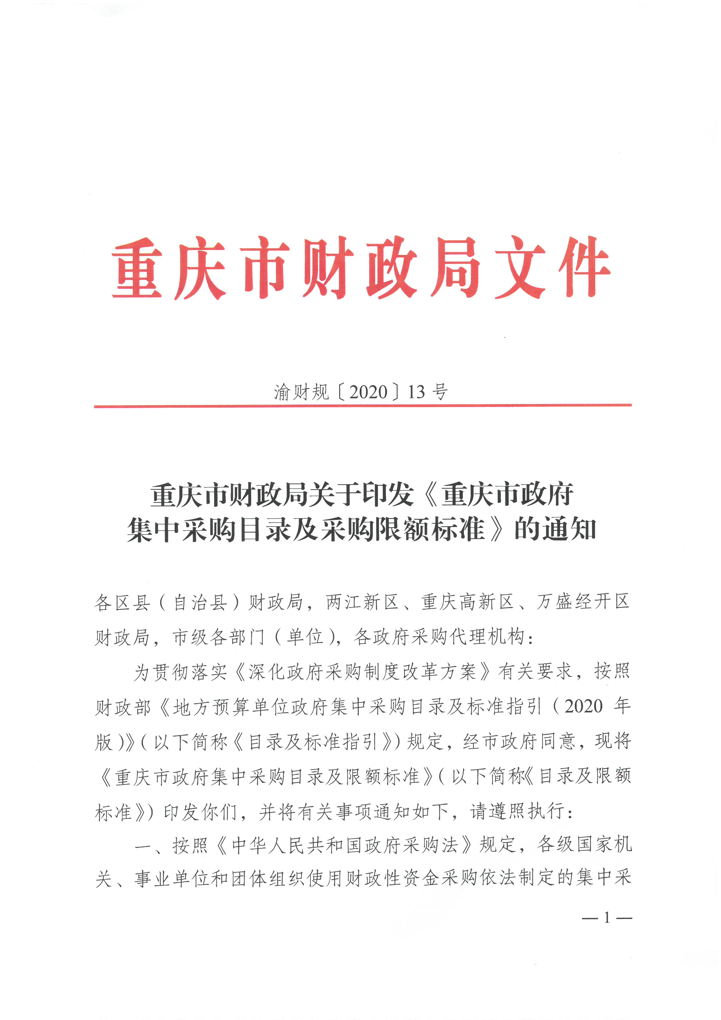 现将《重庆市财政局关于印发〈重庆市政府集中采购目录及采购限额标准〉的通知》(渝财规〔2020〕13号)转发给你们,请结合以下有关要求一并贯彻执行: