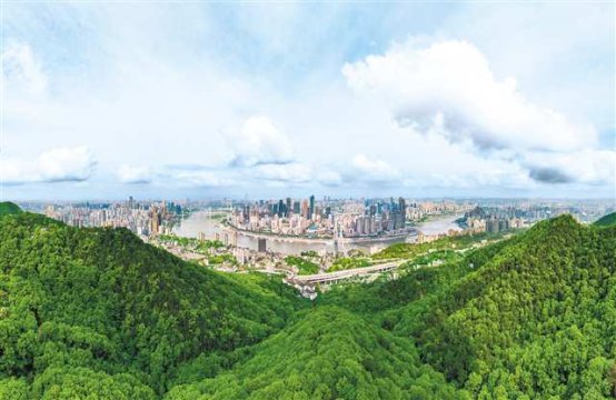 从南山眺望蓝天白云下的重庆城区。