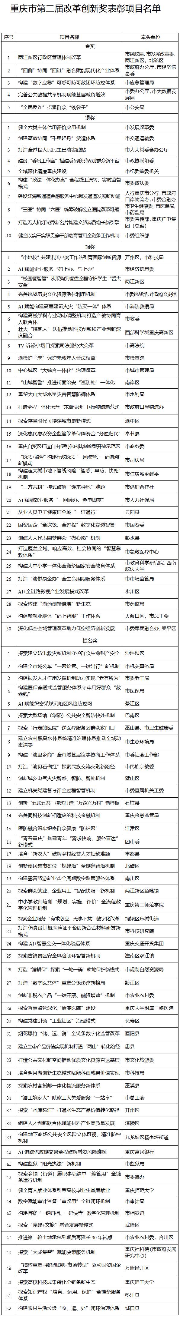 本届改革创新奖共评选出金奖5项、银奖10项、铜奖30项、提名奖52项。获奖项目涵盖经济发展、超大城市现代化治理、民生保障等关键领域,集中展现了现代化新重庆建设进程中全面深化改革的创新成效。