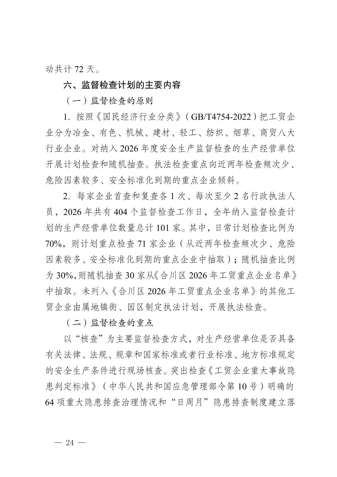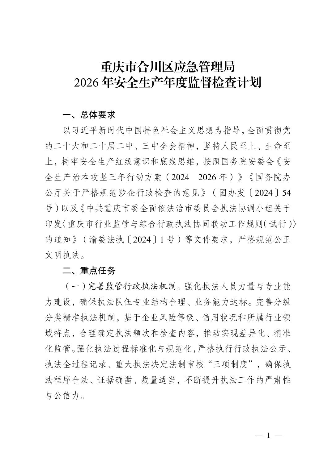 | [标 题] | 重庆市合川区应急管理局2026年安全生产年度监督检查计划 | ||