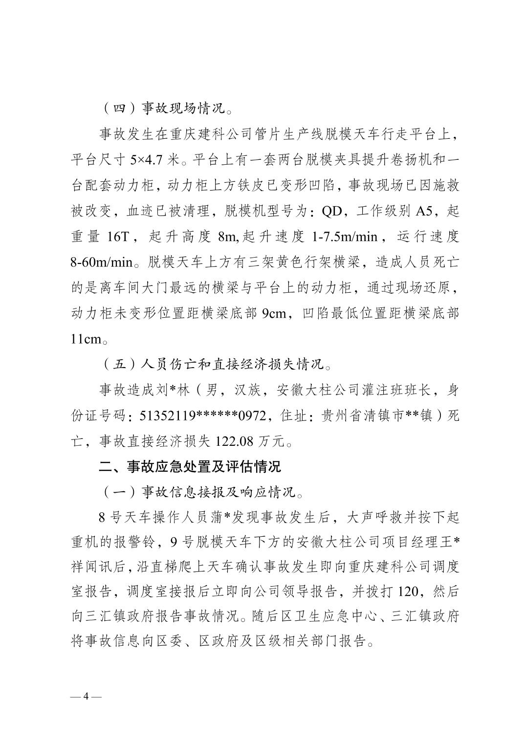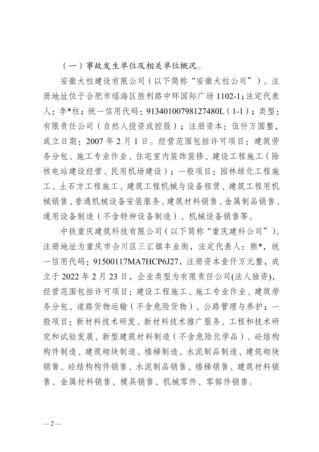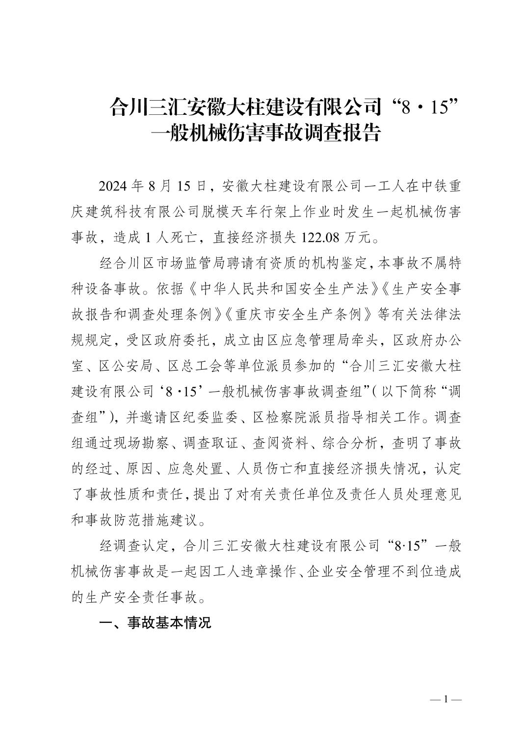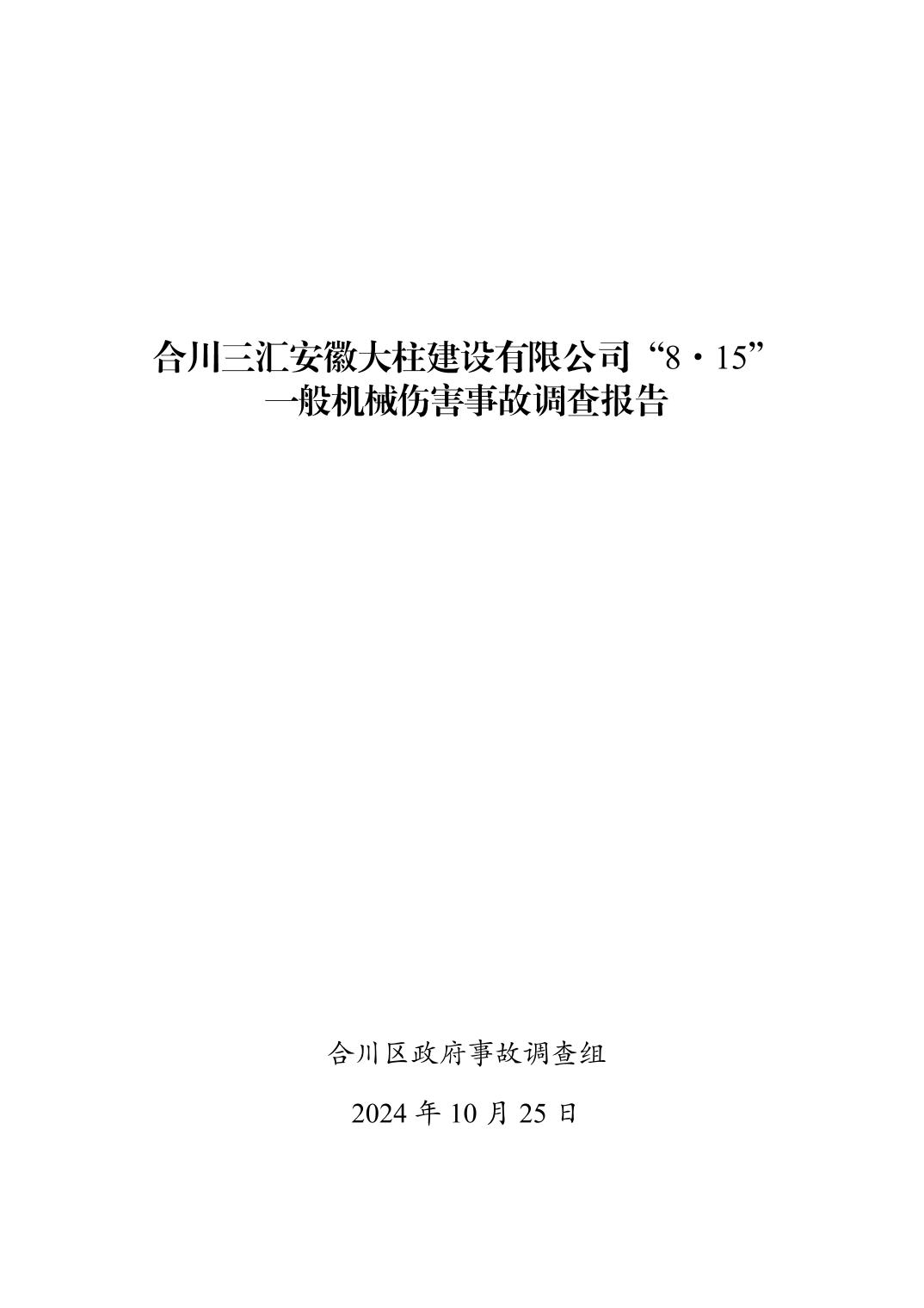 | [标 题] | 合川三汇安徽大柱建设有限公司8.15一般机械伤害事故调查报告 | ||