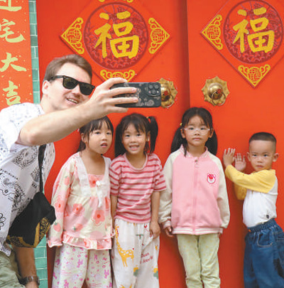 10月14日,在福建省福安市下白石镇下岐村,撒普尔(左一)与孩子们合影。