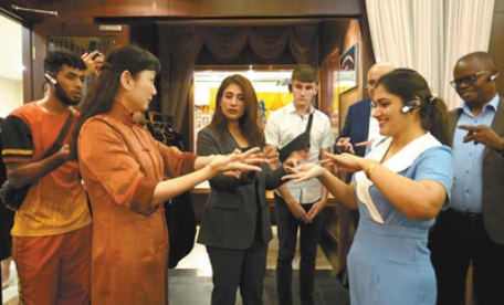 10月11日,代表团成员在上海古北市民中心学习昆曲手势。