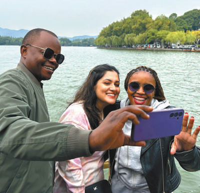 10月13日,代表团成员在浙江省杭州市西湖景区合影留念。