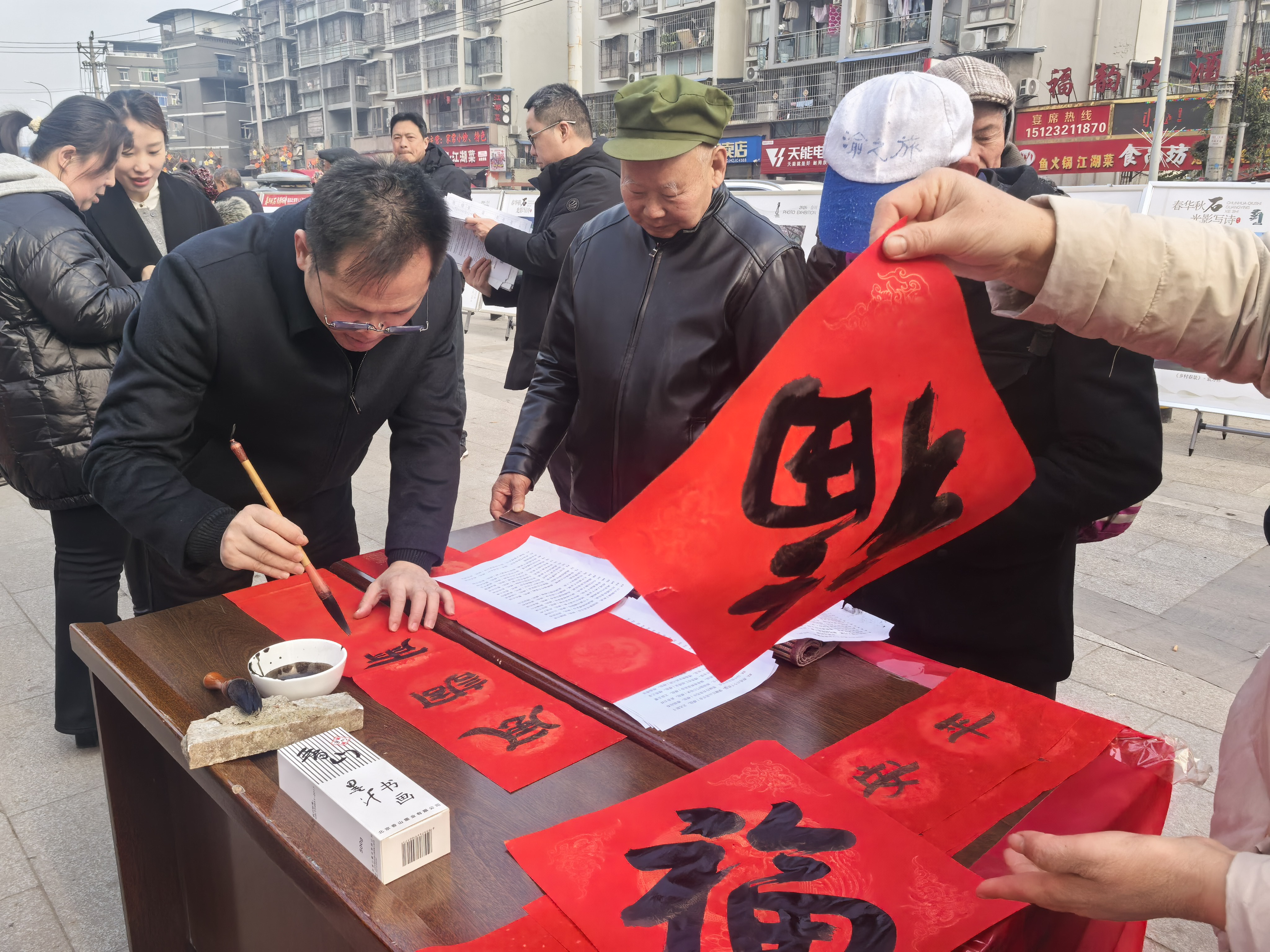 合川区钓鱼城书画协会志愿者挥毫泼墨,免费为居民书写春联、赠送福字,墨香四溢传递新春祝福。