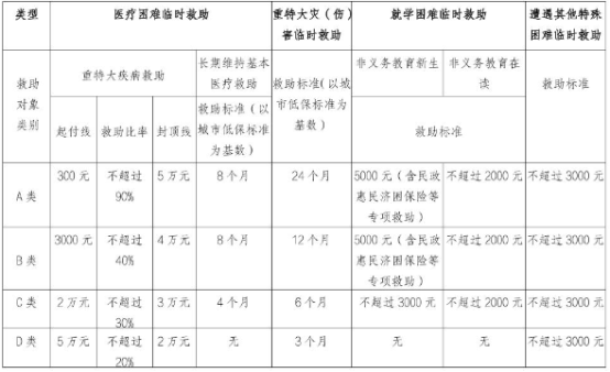 我区临时救助按照申请家庭困难原因划分为:医疗困难临时救助、重特大灾(伤)害临时救助、就学困难临时救助、遭遇其他特殊困难临时救助,具体标准详见下表: