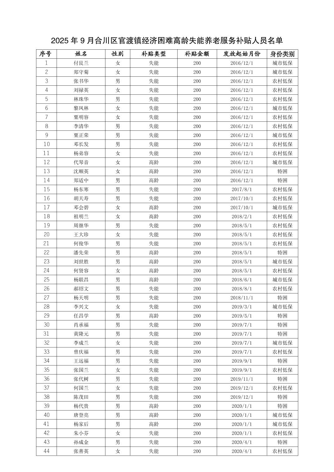 | [标 题] | 2025年9月合川区官渡镇经济困难高龄失能养老服务补贴人员名单 | ||
