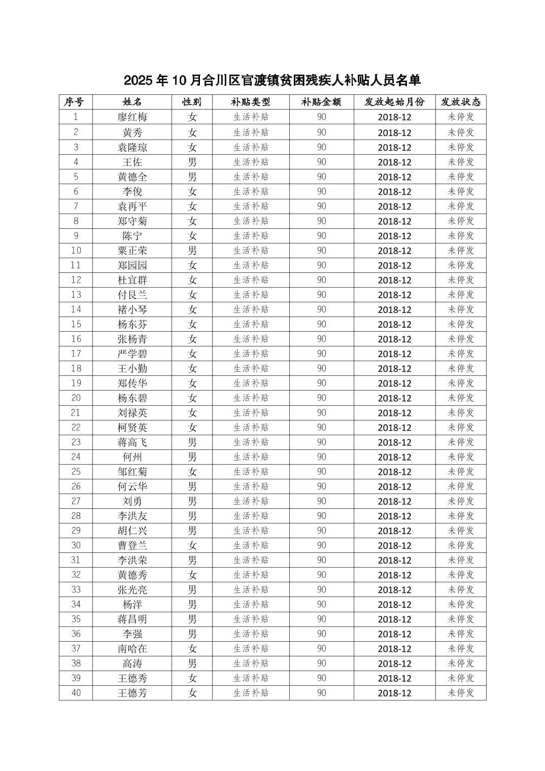 | [标 题] | 2025年10月合川区官渡镇贫困残疾人补贴人员名单 | ||