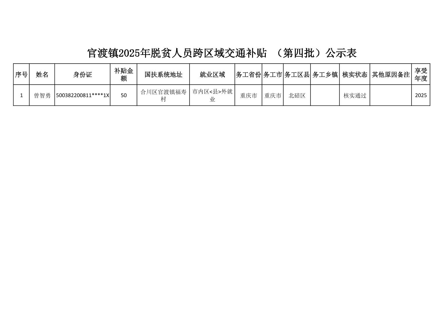 | [标 题] | 官渡镇2025年脱贫人员跨区域交通补贴(第四批)公示表 | ||