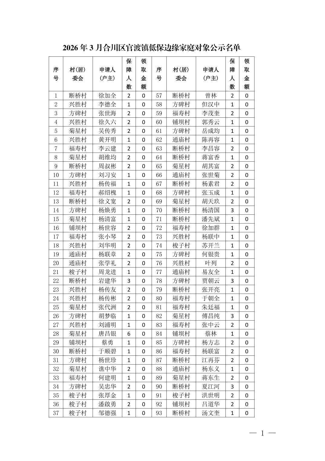 | [标 题] | 2026年3月合川区官渡镇低保边缘家庭对象公示名单 | ||