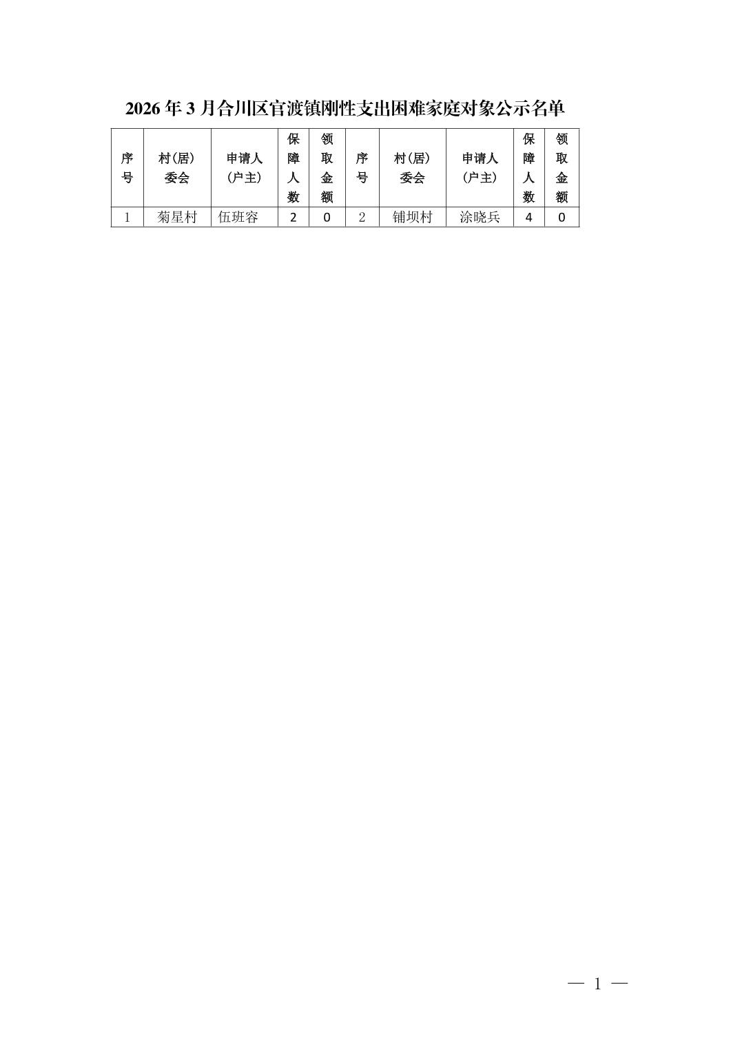 | [标 题] | 2026年3月合川区官渡镇刚性支出家庭对象公示名单 | ||