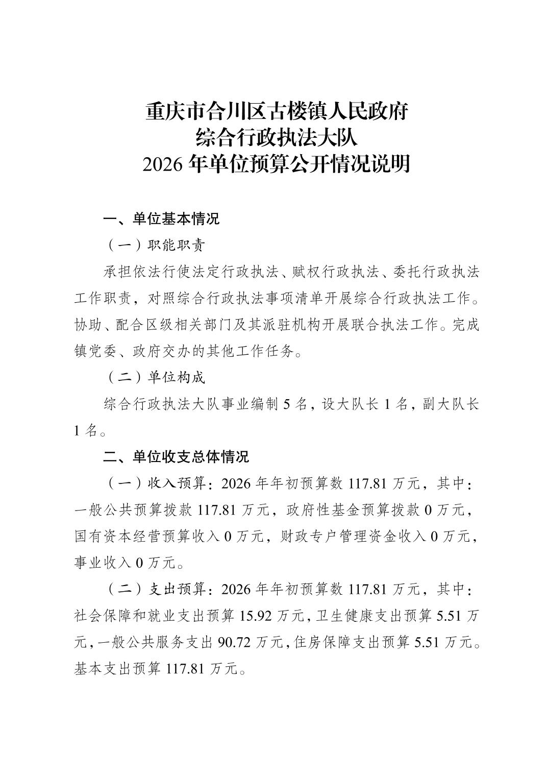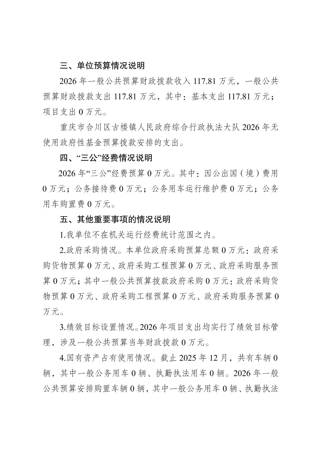 | [标 题] | 重庆市合川区古楼镇人民政府综合行政执法大队2026年单位预算公开情况说明 | ||