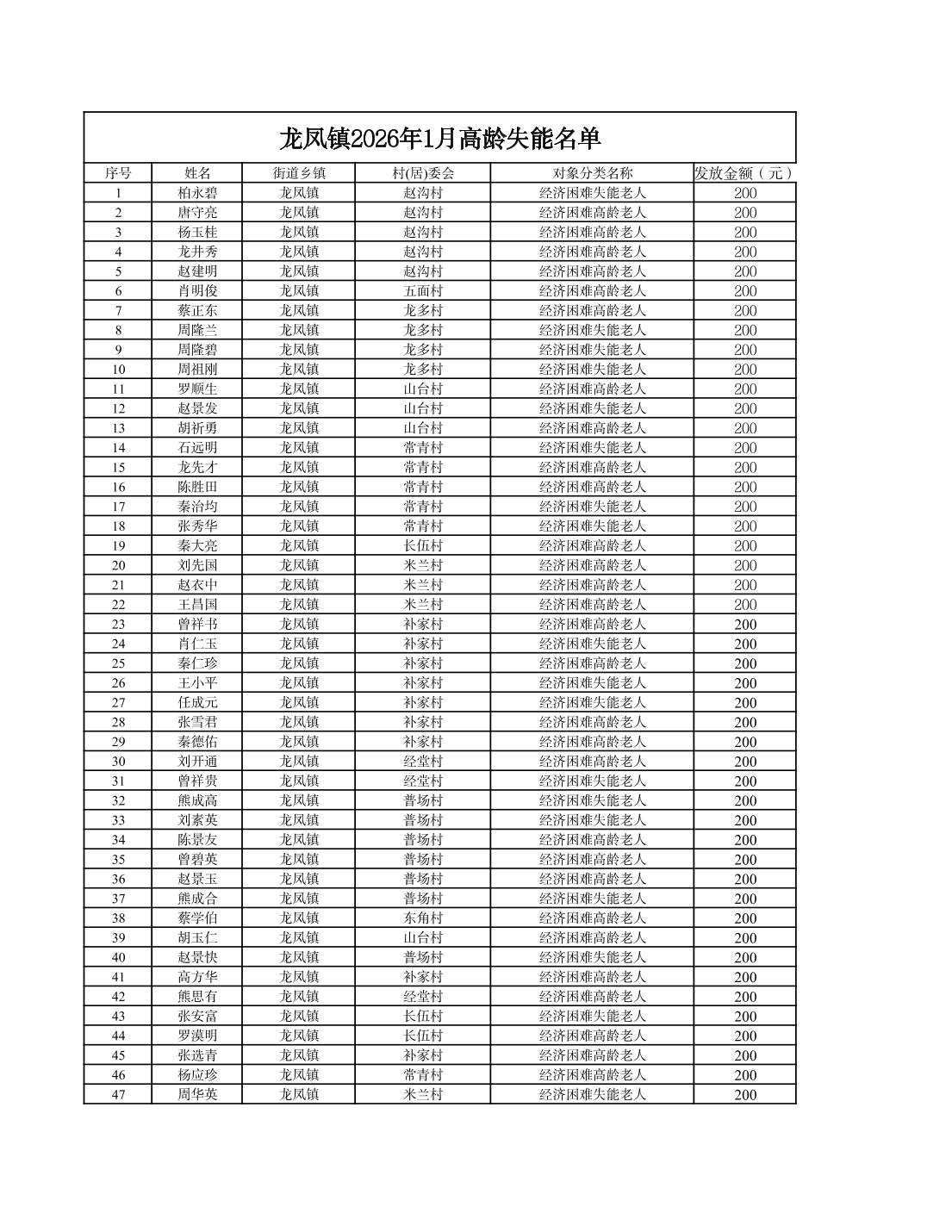 | [标 题] | 2026年1月龙凤镇高龄失能养老服务补贴公示名单 | ||