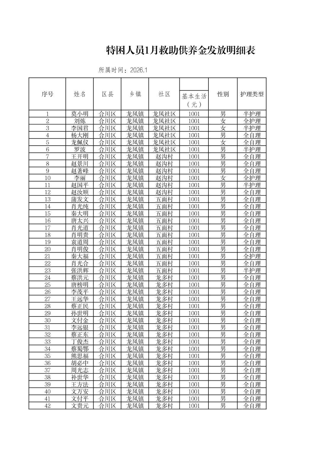 | [标 题] | 特困人员1月救助供养金发放明细表 | ||