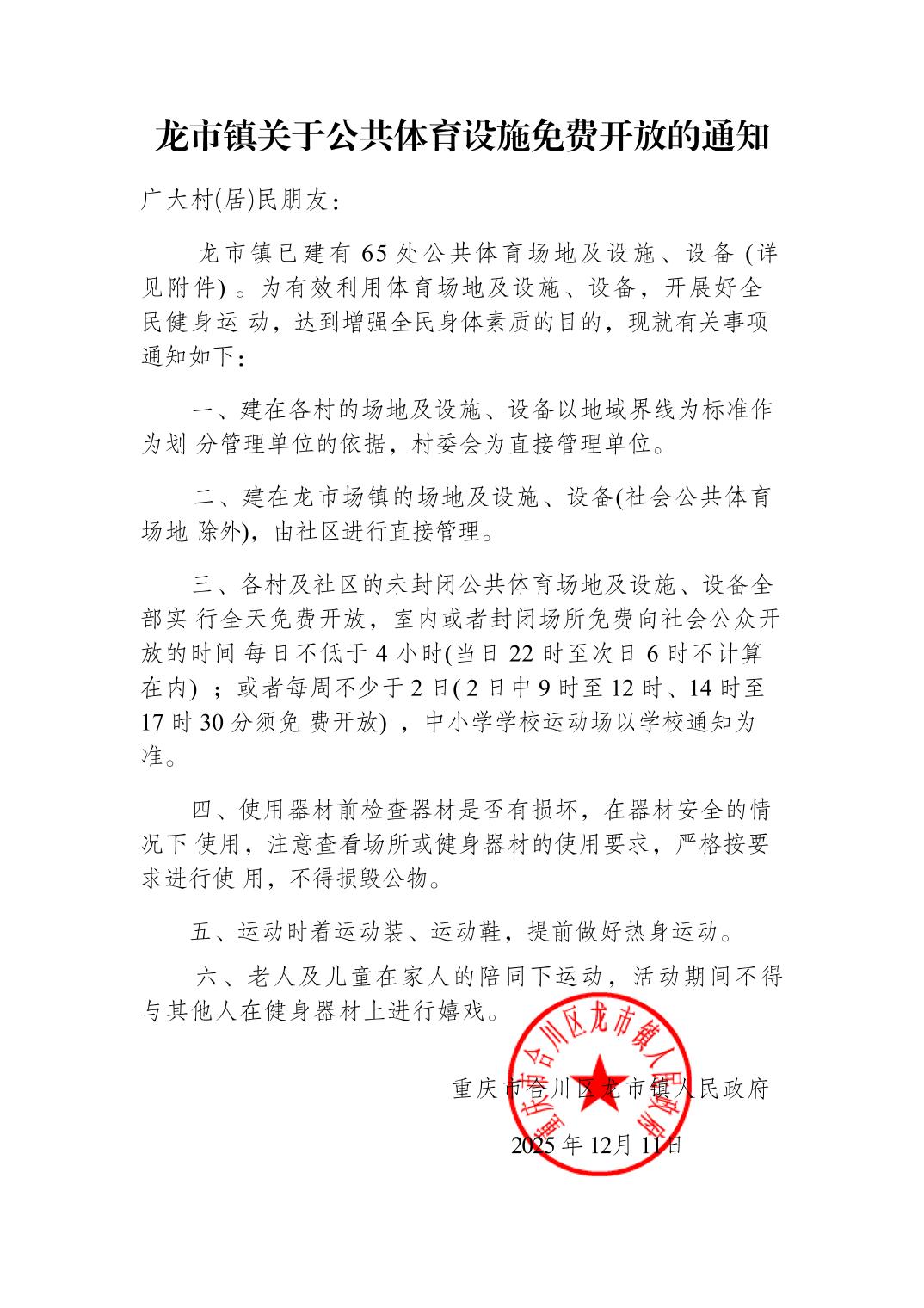 | [标 题] | 龙市镇关于公共体育设施免费开放的通知 | ||