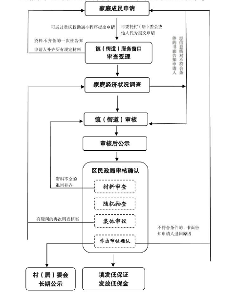 《重庆市城乡居民最低生活保障条例》第五条:市民政部门负责全市最低生活保障的综合管理、指导和监督工作。区县(自治县)民政部门负责本行政区域内最低生活保障的管理、审核确认工作。乡(镇)人民政府、街道办事处负责最低生活保障的申请受理、调查核实、群众评议、张榜公示、定期核查等工作。