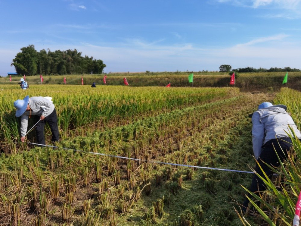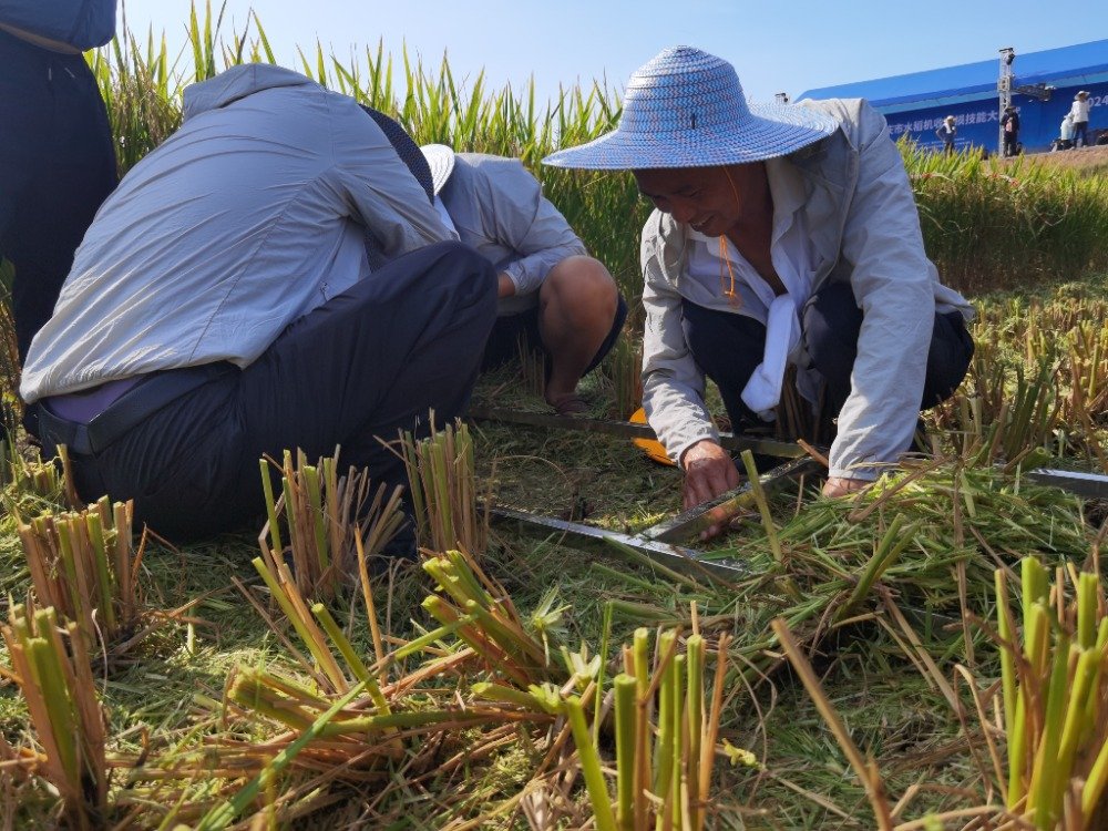 见第一组选手操作完毕,工作人员立马上到稻茬里数谷子:先是用卷尺测定稻田的长宽,以此确定机收面积。再用绳子圈出一平方米的测定区,抓起稻茬间的秸秆碎屑一颗颗寻找漏掉的稻谷,以此计算出损失率。