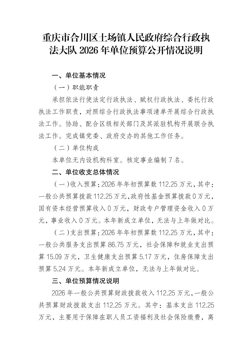 | [标 题] | 重庆市合川区土场镇人民政府综合行政执法大队2026年单位预算公开情况说明 | ||