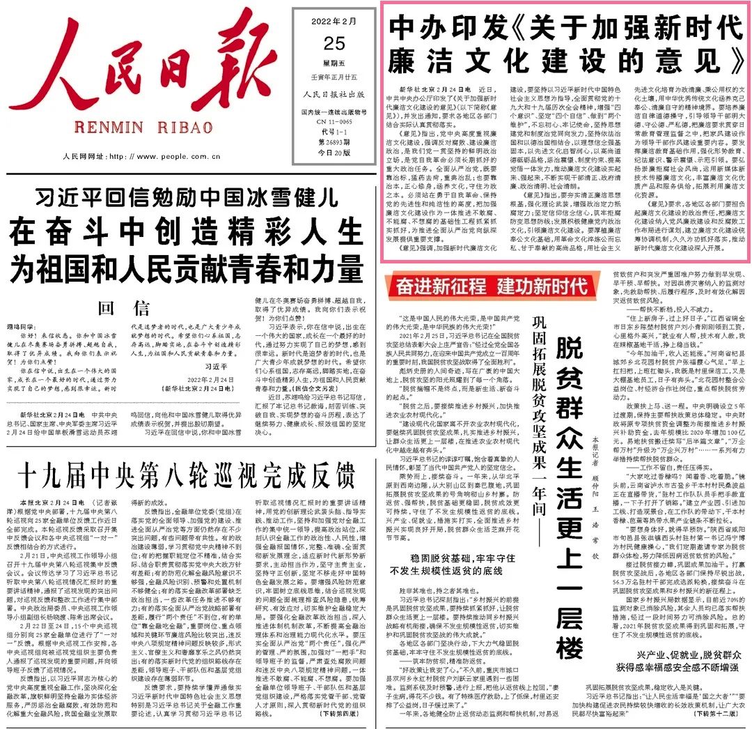 2022年2月,中共中央办公厅印发了《关于加强新时代廉洁文化建设的意见》。《意见》指出,必须站在勇于自我革命、保持党的先进性和纯洁性的高度,把加强廉洁文化建设作为一体推进不敢腐、不能腐、不想腐的基础性工程抓紧抓实抓好。图为《人民日报》相关版面。