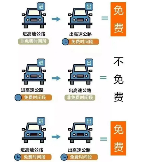 按照有关规定,免费通行时段从节假日第一天,即10月1日0时开始,到节假日最后一天,即10月8日24时结束,普通公路以车辆通过收费站收费车道的时间为准,高速公路以车辆驶离出口收费车道的时间为准。也就是说,只要在免费时段驶出收费公路,即可免收通行费。对于在免费时段即将结束前仍在高速公路行驶的车辆,可以根据实际位置和时间,就近选择收费站驶离高速公路。