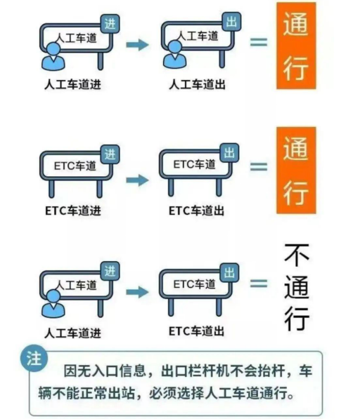 特别是在人工通道上的高速,下高速时不要选择ETC通道,否则将无法正常通行,因没有入口信息,出口栏杆机不会抬杆,只能折返至人工车道驶出。