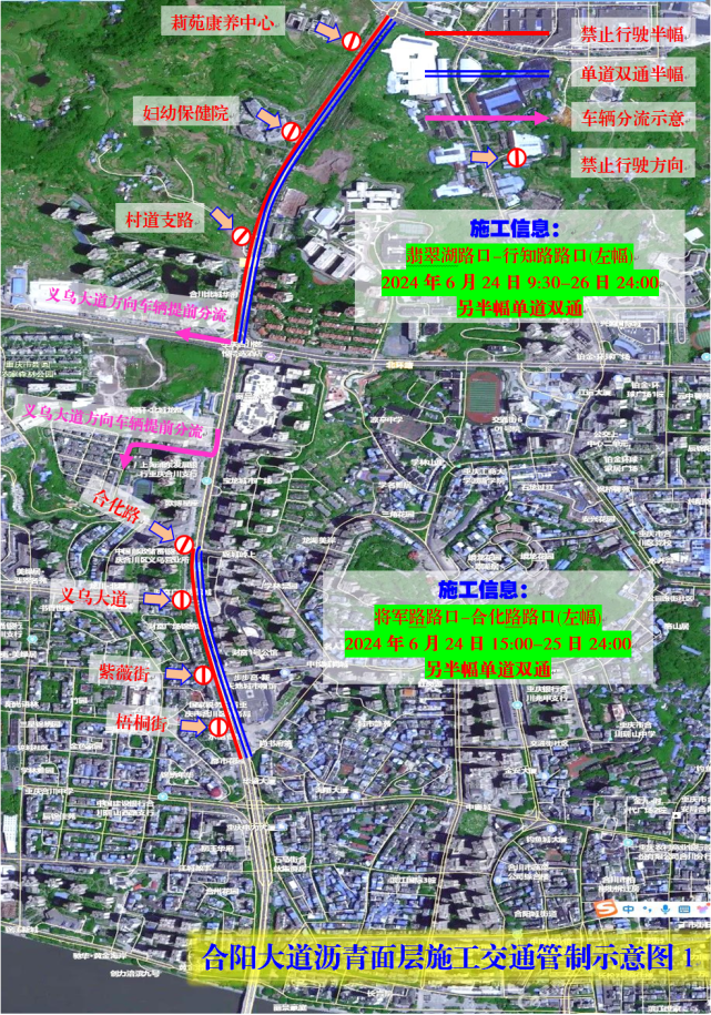 特别说明:施工期间,右幅道路(施工的另外半幅)将采用单道双通进行临时交通管制;与施工路段平交的各个路口在路面清扫后将临时断道,车辆需绕行(特别是义乌大道方向车辆需提前分流);妇幼保健院路口在清洁后保留路口通行,沥青摊铺后将存在2-3小时短暂临时断道(降至合适温度时提前洒水降温)。
