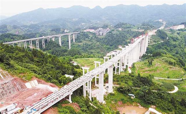 近日,合川至长寿高速公路控制性工程新桥大桥合龙,建设者正在现场紧张施工。