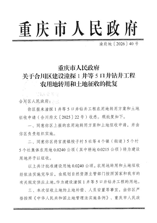 附件:1.重庆市人民政府关于合川区建设潼探1井等5口附件:1.井钻井工程农用地转用和土地征收的批复(渝府附件:1.地〔2026〕40号)